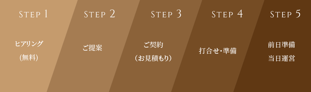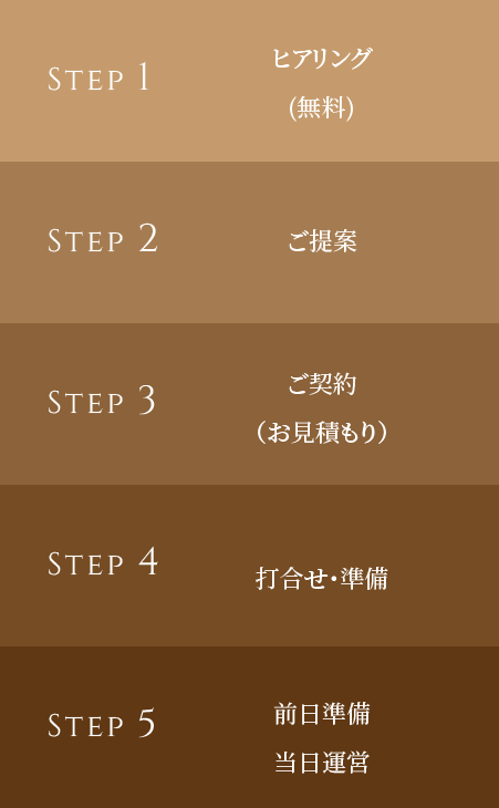 まずはお二人のこれまでの物語をヒアリングしながら、お二人にとって「大切なこと」を見つけます。結婚式で「やりたいこと」、「やりたくないこと」のイメージを具体化させながら、お二人だけの結婚式をデザインしていきます。